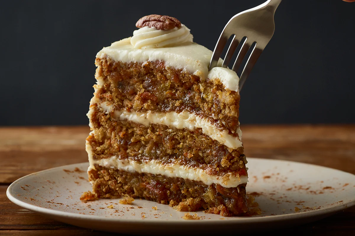 Moist layers of carrot cake with coconut and pecans topped with a sweet vanilla cream cheese icing.