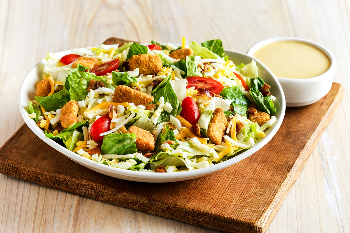 Fresh mixed greens, chopped hard-boiled eggs, tomatoes, bacon, Monterey Jack and Cheddar cheese and croutons. Served with your choice of dressing.