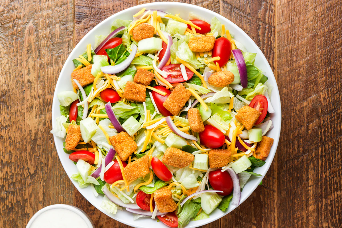 Fresh mixed greens, dressing of choice, cucumbers, Monterey Jack and Cheddar cheese, tomatoes, red onions and homemade croutons