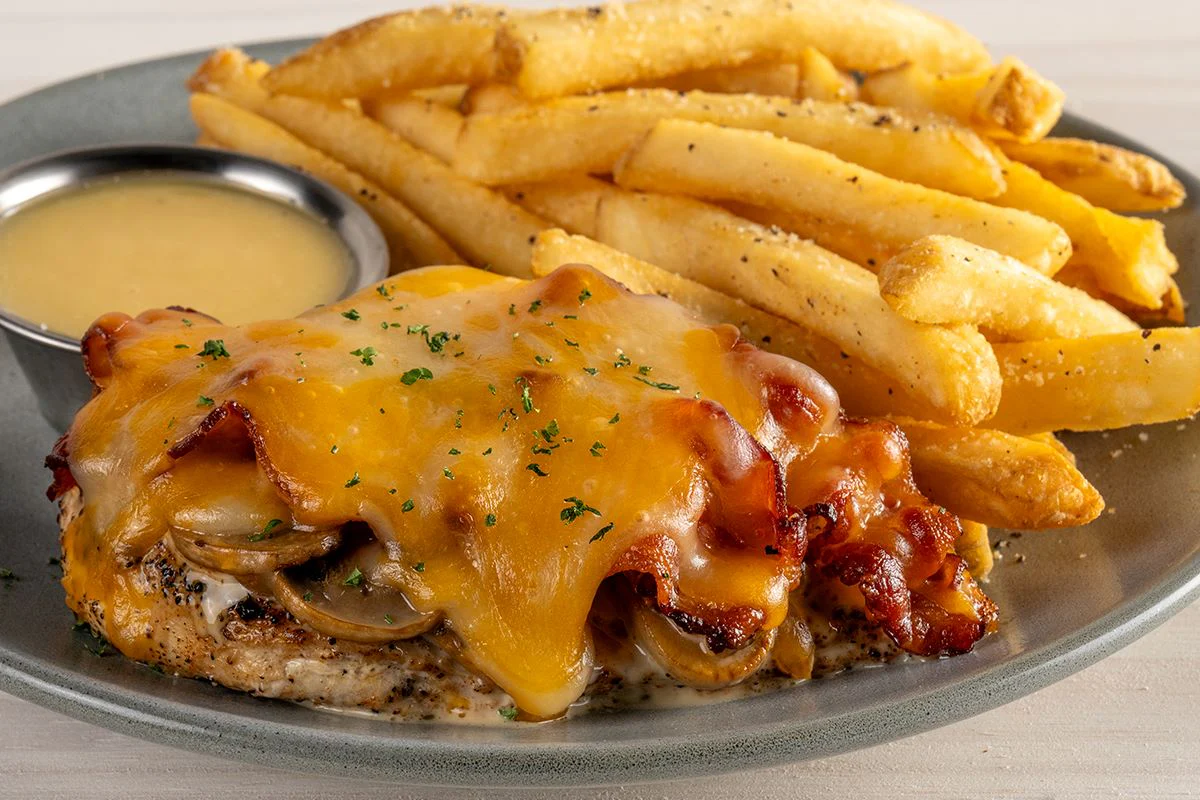 Grilled chicken breast topped with sautéed mushrooms, crisp bacon, melted Monterey Jack and Cheddar and honey mustard sauce. Served with two freshly made sides.