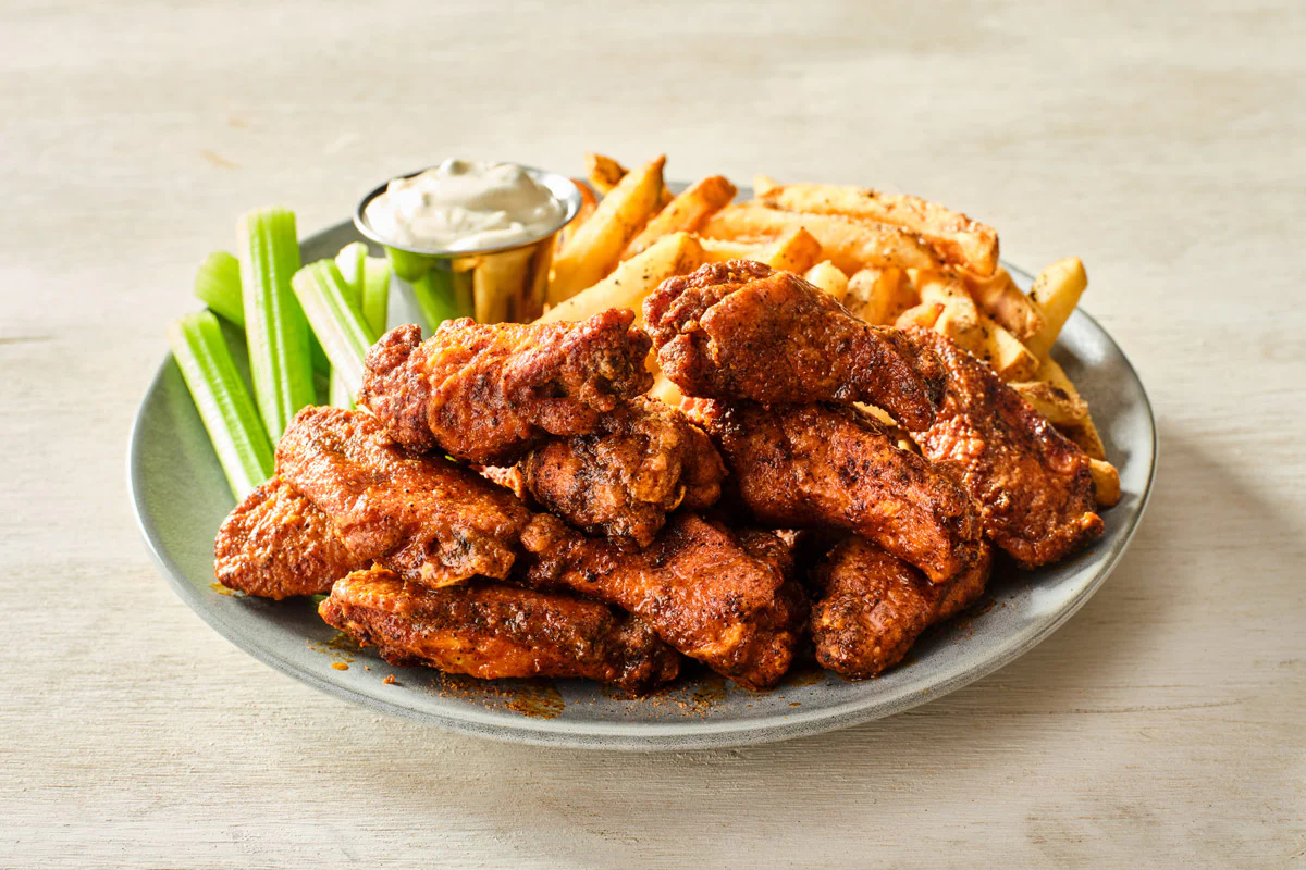 Chicken wings tossed in our secret spices served with our Blue Cheese dressing and celery. Choose mild, medium, or hot. Served with one freshly made side.